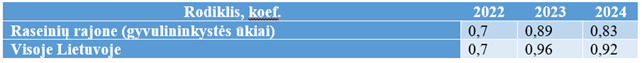 Žema rodiklio reikšmė, ypač neigiama (nuostoliai), rodo, kad ūkiai yra priklausomi nuo paramos, veiklą vykdė neefektyviai ar net nuostolingai ir be dotacijų, susijusių su pajamomis, jos vykdyti negalėtų. 2023–2024 m. šis rodiklis Raseinių r. buvo net minusinis, o Lietuvos vidutinis visais metais taip pat minusinis. Vadinasi 2022 m. Raseinių r. ūkininkai buvo mažiau priklausomi nuo dotacijų, negu kitais analizuojamais metais.