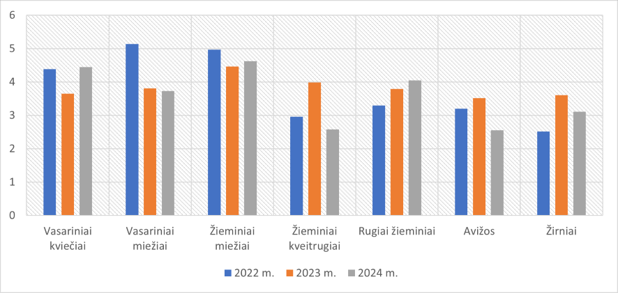 Pagal pateiktą 1 diagramą matome, kad lyginamas 3 metų derlingumas tonomis iš 1 ha. Duomenys atspindi septynių pagrindinių augalų derlingumą (t/ha): vasarinių kviečių, vasarinių miežių, žieminių miežių, žieminių kvietrugių, žieminių rugių, avižų ir žirnių.