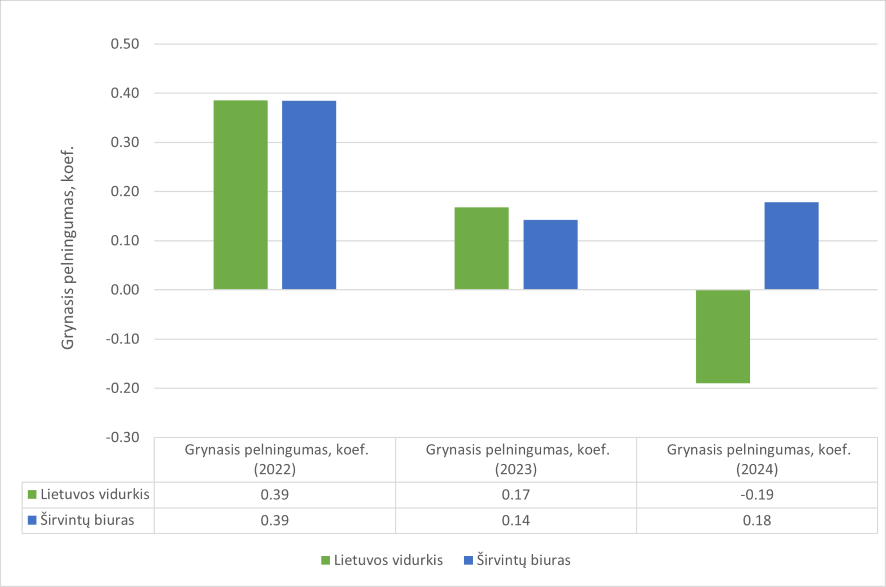 Širvintų r. ūkininkai 2024 m. dirbo pelningai – grynojo pelningumo rodiklis siekė +0,18, kuomet Lietuvos respondentinių ūkių vidurkis buvo neigiamas ir siekė -0,19 (3 pav.). Matome, kad rajone vienas euras pajamų uždirbo 0,18 Eur pelno. Širvintų r. ūkių grynojo pelningumo rodiklis 2024 m. ne tik pagerėjo, bet ir reikšmingai viršijo Lietuvos respondentinių ūkių vidurkį, kuris buvo neigiamas. Tai rodo, kad rajono ūkininkai ne tik sugebėjo prisitaikyti prie sudėtingų ekonominių sąlygų, jie dirbo pelningai.