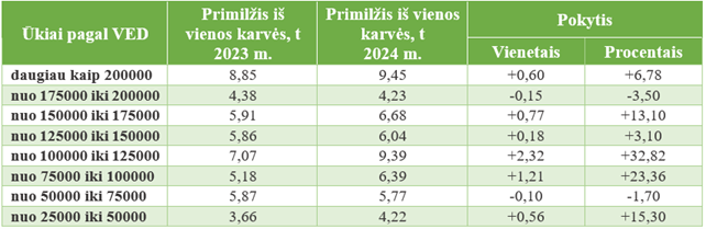Lygindami pateiktus duomenis matome, kad primilžis sumažėjo tik dviejose grupėse, t. y. stambiuose ir mažuose ūkiuose. Sumažėjimą grupėje nuo 50000 iki 75000 EDV galėjo lemti tai, kad Skuodo rajone pastebima ūkių stambėjimo tendencija. Tai reiškia, kad nors tradiciškai buvo daug mažesnių šeimos ūkių, rajone vis labiau formuojasi didesni ar struktūriškai stipresni ūkiai, o mažų sumažėjo. Taip pat įtakos galėjo turėti karvių amžiaus struktūros pokyčiai, blogesnė pašarų kokybė, brangesni ir sunkiau įsigijami pašarai, klimato ar aplinkos sąlygų pokyčiai.