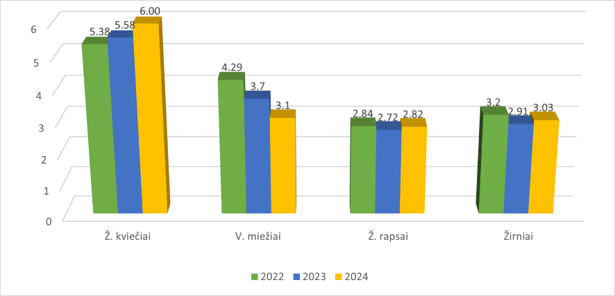 Vasarinių miežių derlingumas trejų metų laikotarpiu nuosekliai mažėjo ir 2024 m. buvo prikulta 3,1 t iš hektaro. Žieminių rapsų derlingumas kito nežymiai, ir trejų metų vidurkis buvo 2,79 t/ha. Iš šių duomenų galima daryti prielaidą, kad augintų kultūrų derlingumą daugiausia veikė klimato sąlygos, ypač nuimant derlių, žemės našumas, subalansuotas tręšimo ir augalų apsaugos priemonių naudojimas ūkiuose.