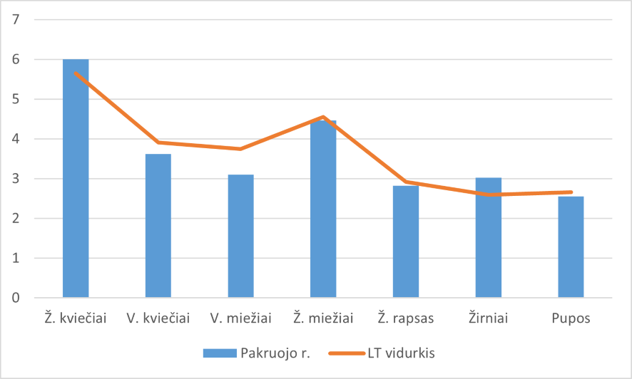 Pažymėtina, kad Pakruojo r. respondentiniuose ūkiuose augintų kultūrų derlingumai nežymiai viršijo Lietuvos ūkių vidurkius arba buvo šiek tiek mažesni. Išsiskyrė tik vasarinių miežių derlingumas. Pakruojo r. prikulta 3,10 t/ha, o Lietuvos respondentų vidurkis siekė 3,75 t/ha. Iš šių duomenų galima daryti prielaidą, kad didesnį rajone augintų kultūrų derlingumą lėmė derlinga žemė ir tikslingai taikomi ūkininkavimo metodai, subalansuotas trąšų ir augalų apsaugos priemonių naudojimas.