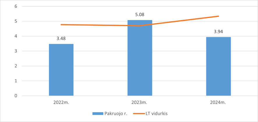Skolos rodiklis yra vienas pagrindinių finansinės rizikos rodiklių, kuris rodo bendrą ūkio įsiskolinimo lygį, kokia dalis skolintų lėšų panaudojama formuojant ūkio turtą. Rekomenduotina rodiklio reikšmė – ne didesnė nei 0,6. Kuo ji didesnė, tuo patiriama didesnė finansinė rizika ir sunkiau, susiklosčius nepalankioms sąlygoms, bus vykdyti prisiimtus įsipareigojimus. Kaip matyti, Pakruojo r. šis rodiklis trejų metų laikotarpiu išliko stabilus ir 2024 m. siekė 0,29. Pakruojo r. ūkininkai skolinasi saikingai, įvertinę visas galimas rizikas.