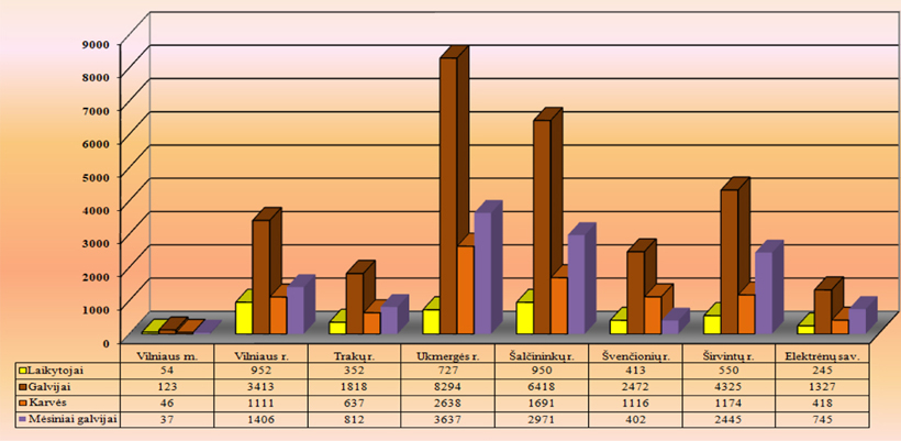 Diagramoje matome, kad Trakų r. 2018 m. gruodžio 31 d. buvo užregistruoti 352 galvijų laikytojai (2017 m. – 404), kurie laikė 1818 vnt. galvijų (2017 m. – 1831). Kalbant apie karvių skaičių, tai 2018 m. gruodžio 31 d. Trakų r. registruotos 637 karvės (2017 m. – 677). Lygindami pateiktas lenteles, matome, kad Trakų r. mažėjo ir galvijų laikytojų, ir laikomų galvijų skaičius.