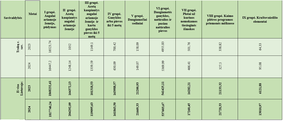 Analizuodami 2 lentelę, matome, kad 2023 ir 2024 m. tiek Trakų rajone, tiek Lietuvoje didžiausią dalį pasėlių struktūroje sudarė augalai ariamoje žemėje, pūdymas, daugiametės ganyklos, natūralios ir pusiau natūralios pievos.