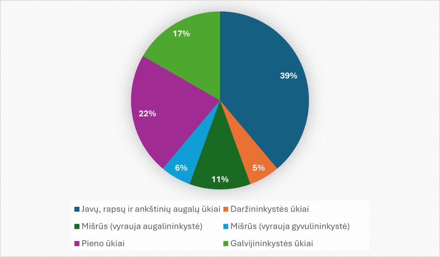 Visuose augalininkystės ūkiuose auginti javai, rapsai ir ankštiniai augalai, vienas ūkis vertėsi daržininkyste. Iš 3 mišrių ūkių dviejuose vyravo augalininkystė, o viename – gyvulininkystė. Tarp 7 gyvulininkystės ūkių – 4 pieno ūkiai ir 3 galvijininkystės (mėsinių galvijų auginimo) ūkiai (1 pav.).
