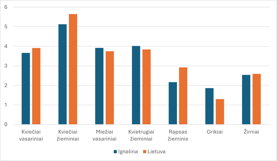 2 pav. Ignalinos r. ūkių ir Lietuvos ūkių žemės ūkio augalų derlingumo 2024 m. palyginimas, t/ha