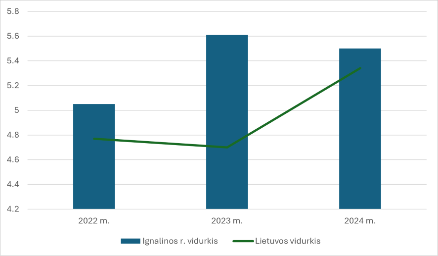 Ignalinos r. ūkiuose ir vidutiniškai Lietuvos ūkiuose primilžio iš karvės dinamika 2022–2024 m. pateikta 4 paveiksle. Matyti, kad Ignalinos rajone primilžis iš vienos karvės visais nagrinėtais metais buvo šiek tiek didesnis nei šalies vidurkis. Per trejus metus Ignalinos rajone primilžis iš vienos karvės padidėjo 8,9 proc., o Lietuvoje – 11,9 proc. Nors augimo tempai buvo panašūs, Ignalinos r. pieno ūkių produktyvumas išliko aukštesnis nei šalies vidurkis visais nagrinėtais metais.