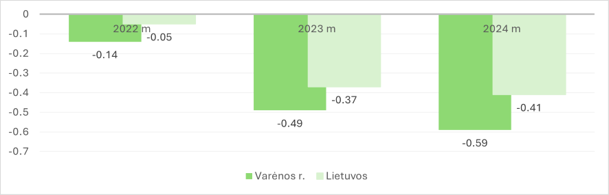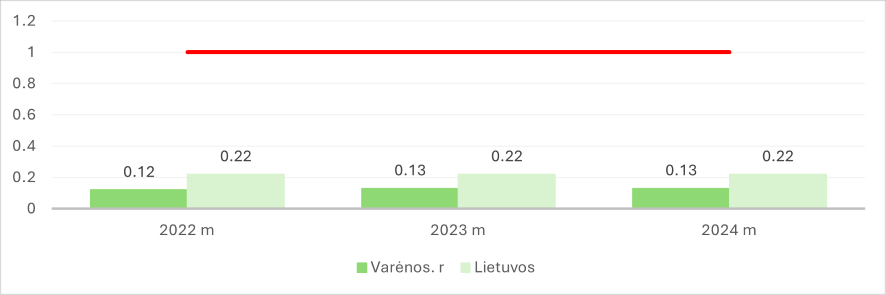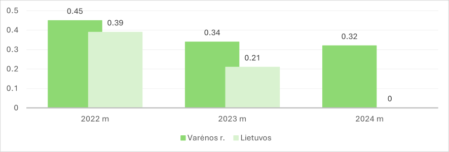 Dauguma Varėnos r. respondentų ūkių analizuojamu 2022–2024 m. laikotarpiu vykdė veiklą pelningai ir stabiliai. Šiuo laikotarpiu Varėnos r. respondentinių ūkių grynasis pelningumas viršijo Lietuvos vidurkį, o 2024 m. skirtumas siekė 0,32 koef. (žr. 1 pav.).