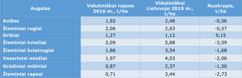 Apžvelgus 2016 m. duomenis, pastebima, kad didžiausias buvo kviečių derlingumas (2,09 t/ha), o mažiausias rapsų (0,71 t/ha).