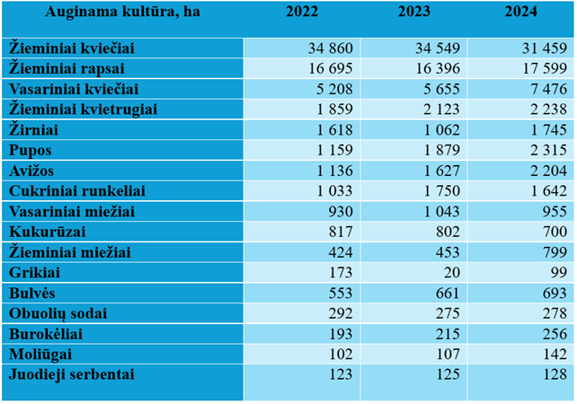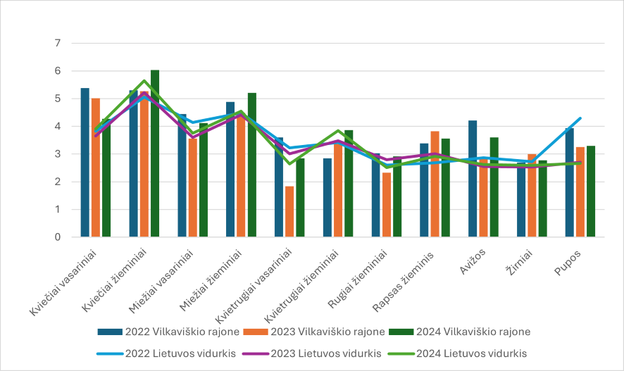 Lyginant 2022–2024 m., Vilkaviškio rajone didžiausias žieminių javų derlingumas buvo 2024 m. (kviečių – 6,03 t/ha, miežių – 5,21 t/ha, kvietrugių – 3,87 t/ha), žieminių rapsų ir žirnių – 2023 m. (rapsų – 3,82 t/ha, žirnių – 2,78 t/ha), vasarinių javų didžiausias derlingumas pasiektas 2022 m. (kviečių – 5,38 t/ha, miežių – 4,45 t/ha, avižų – 4,21 t/ha). Tačiau lyginant Vilkaviškio rajone augintų kultūrų derlingumą su Lietuvos respondentinių ūkių vidurkiu, visais analizuojamais metais akivaizdžiai pastebimas didesnis derlingumas. Vienas iš lemiamų veiksnių – aukštas žemės ūkio naudmenų našumo balas, veislės parinkimas, tinkamas tręšimas bei kenkėjų ir ligų valdymas.