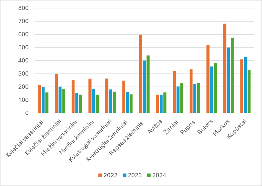 2 pav. Produkcijos kaina 2022–2024 m., Eur/t