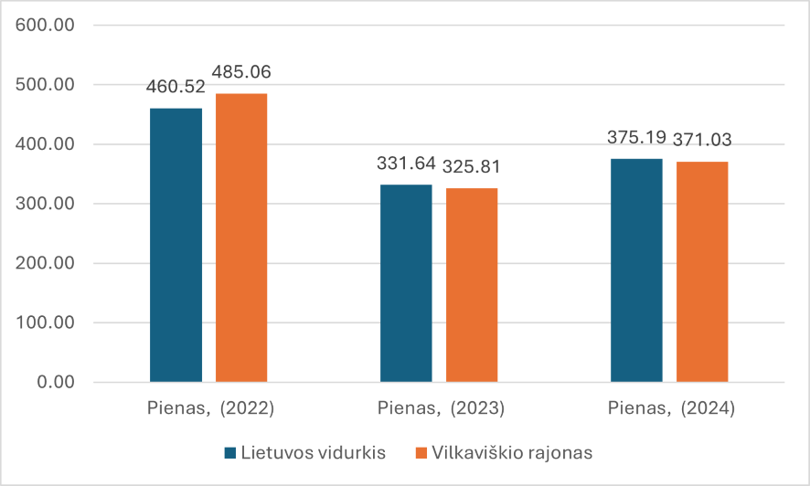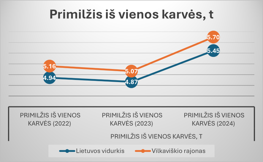 Pagrindiniai gyvulininkystės ūkių veiklos rezultatą lemiantys rodikliai yra primilžis iš vienos karvės ir parduotos produkcijos kaina. Jų dinamiką 2022–2024 m. matome žemiau pateiktose diagramose, iš kurių matome, kad sunkiausi gyvulininkystės ūkiams buvo 2023 m. Lyginant tiek su 2022, tiek su 2024 m., buvo ir mažesnis primilžis iš vienos karvės, ir žemesnės pardavimo kainos. Dėl to 2024 m. stebimas ryškus ūkių pasitraukimas iš rinkos. Vilkaviškio rajone pieno supirkimo kaina mažesnė nei Lietuvos vidurkis, tam įtakos galėjo daryti mažesni priduodami pieno kiekiai, kadangi rajone daugiausiai ūkių, laikančių iki 50 karvių.