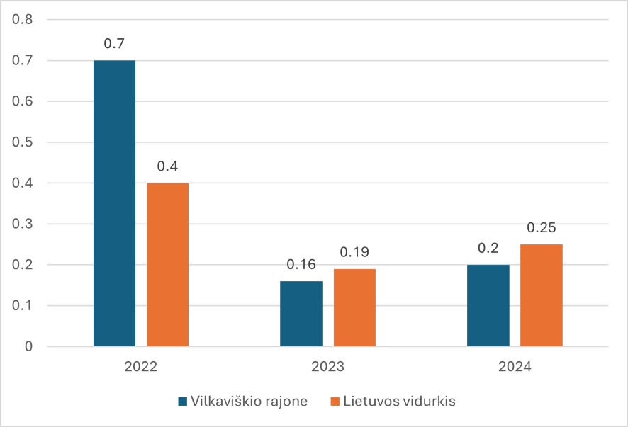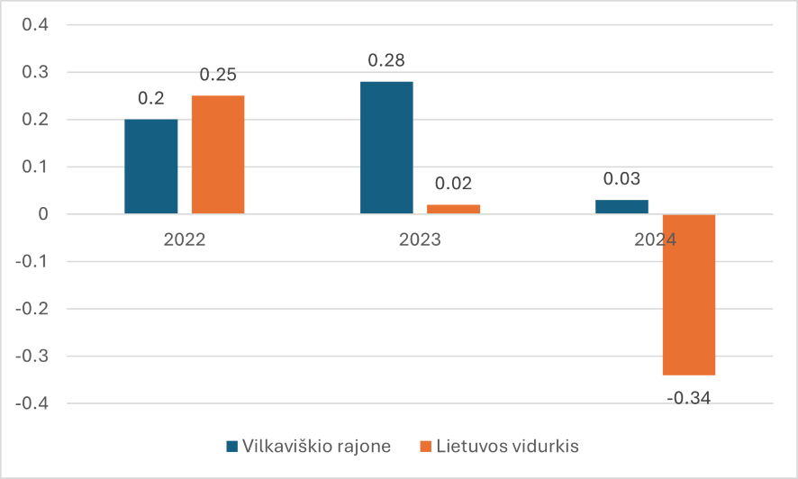 Nors 2022 m. šis rodiklis mūsų rajone buvo žemesnis už Lietuvos vidurkį, bet nepaisant sumažėjusių supirkimo kainų ir produkcijos savikainos padidėjimo, 2023 m. Vilkaviškio rajono ūkių pelningumo rodiklis be dotacijų, susijusių su pajamomis, didesnis nei Lietuvos respondentų vidurkis, o 2024 m. išlieka teigiamas, skirtingai nei Lietuvos vidurkis. Tai rodo, kad mūsų ūkiai yra jautrūs išoriniams veiksniams, ir be dotacijų, susijusių su pajamomis, veiklą vykdyti būtų sunku.