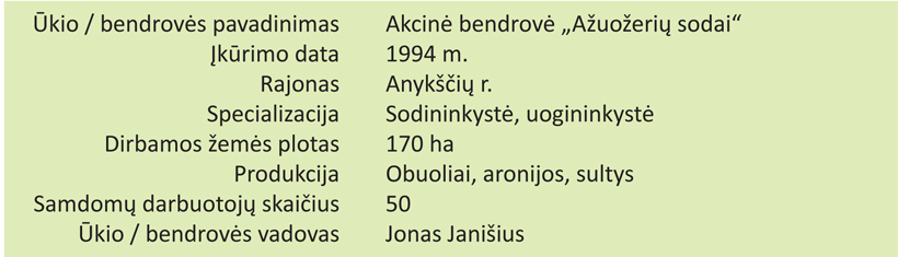 Prieš 25-erius metus (1992 m.) Anykščių r. įsteigta valstybinė įmonė „Sodai“, o 1994 m. vyko valstybinės įmonės akcijų pardavimas – tuomet naujieji akcininkai įsteigė AB ,,Ažuožerių sodai‘‘. Nuo 2002 m. įmonei vadovauja Jonas Janišius.