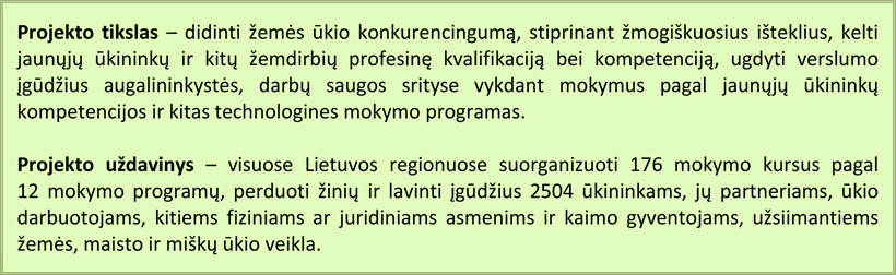 Projektui įgyvendinti pasirinkta 12 mokymo programų, tarp jų ir 4 privalomos jauniesiems ūkininkams.
